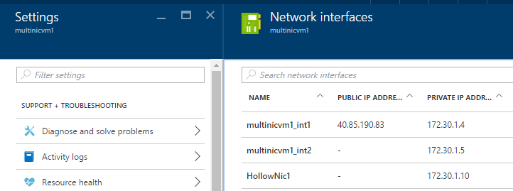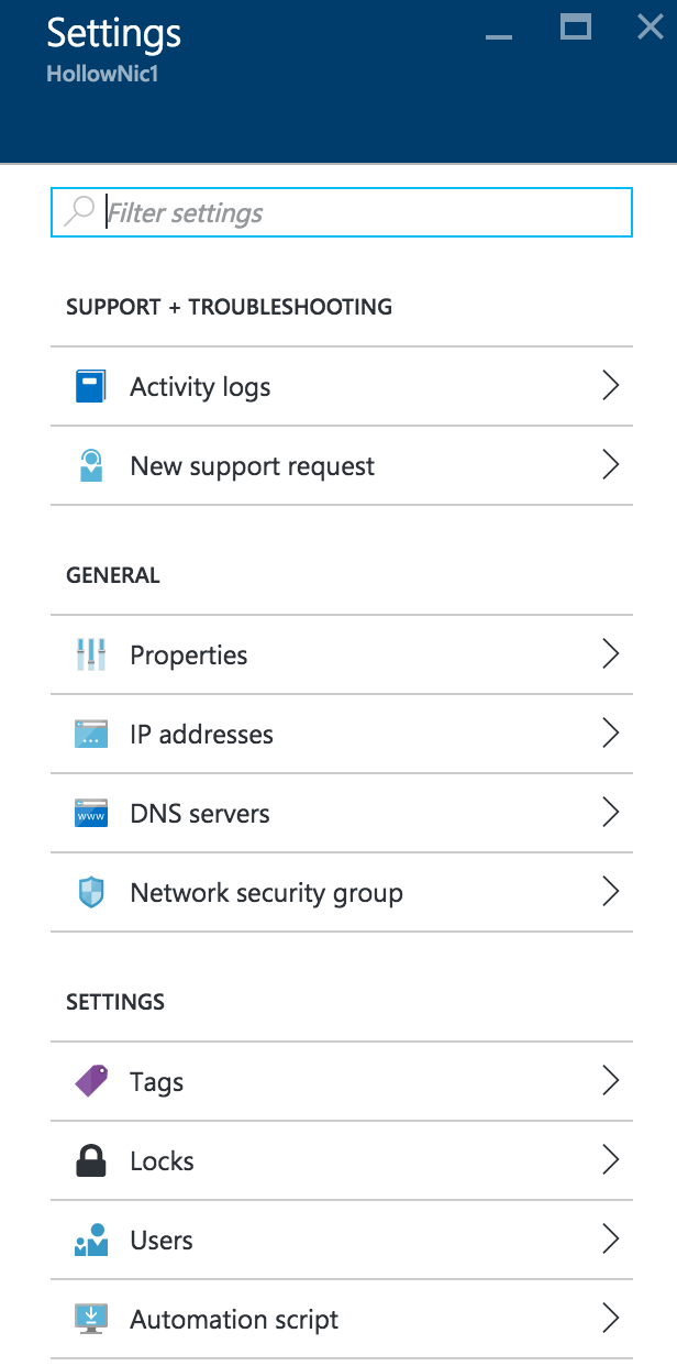 Once you’ve setup the NIC, it will be stored in Azure as an object with its own list of properties. You can drill down into the object to see the IP Addresses security groups and DNS servers that are associated with it.
