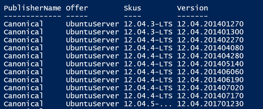 Get-AzureRmVMImagePublisher -Location 'East US' | Get-AzureRmVMImageOffer | Get-AzureRmVMImageSku | Get-AzureRMVMImage | Get-AzureRmVMImage | where {$_.PublisherName -eq “Canonical”} | Select PublisherName, Offer, Skus, Version
