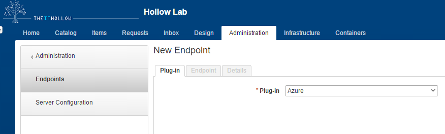 Normally, endpoints are created in the Infrastructure tab under endpoints. In the case of Azure, we go into the Administration tab –> vRO Configuration –> Endpoints. Click the “New” button to add a new endpoint. On the first screen select the Azure plug-in in the drop down.