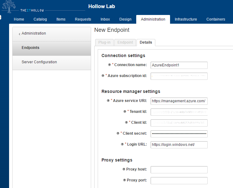 Next, we come to the details tab. Here we’ll need to enter a connection name and fill in the information we’ve collected from our work in Azure. Fill in the subscription ID, Tenant ID, Client ID, Client secret (keys) as well as two settings we didn’t get from Azure. This info should be available from the PowerShell script. Note that the ClientID is also called the ApplicationID in the script.