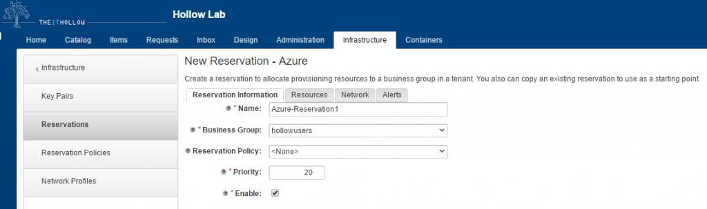 Here you’ll need to give the reservation a name, select a business group that it belongs to and add things like reservation policies as appropriate. Be sure to enable it.
