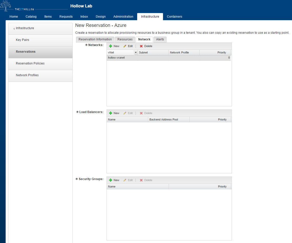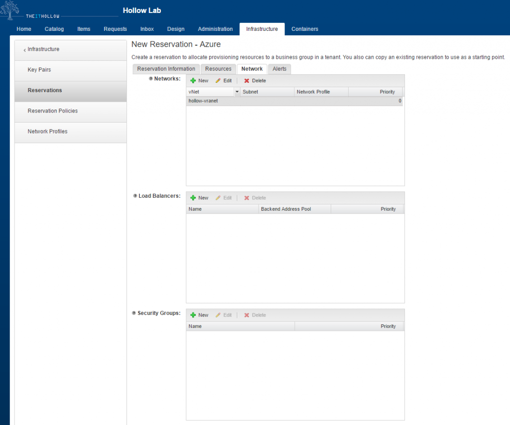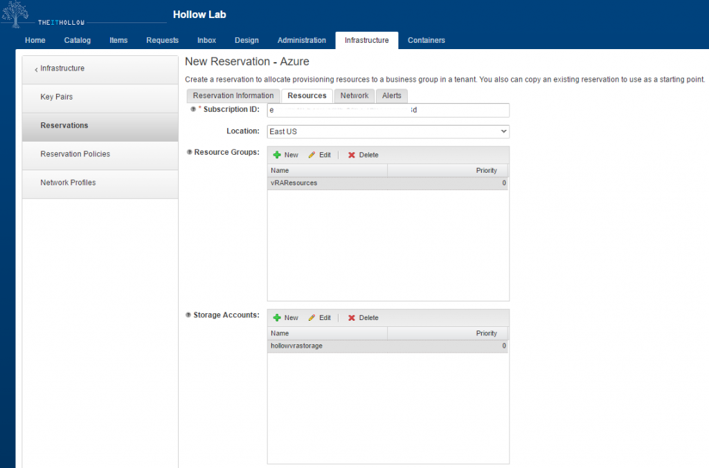 Now our next step after creating an endpoint is usually to add resources to our fabric groups. With an Azure endpoint we can skip that step and go right to reservations. Go to the Infrastructure tab –> Reservations –> Reservations (yep, I said reservations twice).