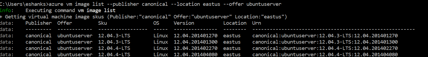 This command takes a bit to come back but you can modify the publisher and export the data to a text file if you like. You may also use the Azure command line tools like Jon does in his post, if you’d prefer to go that route. If you do, the command to find the same publisher would be: