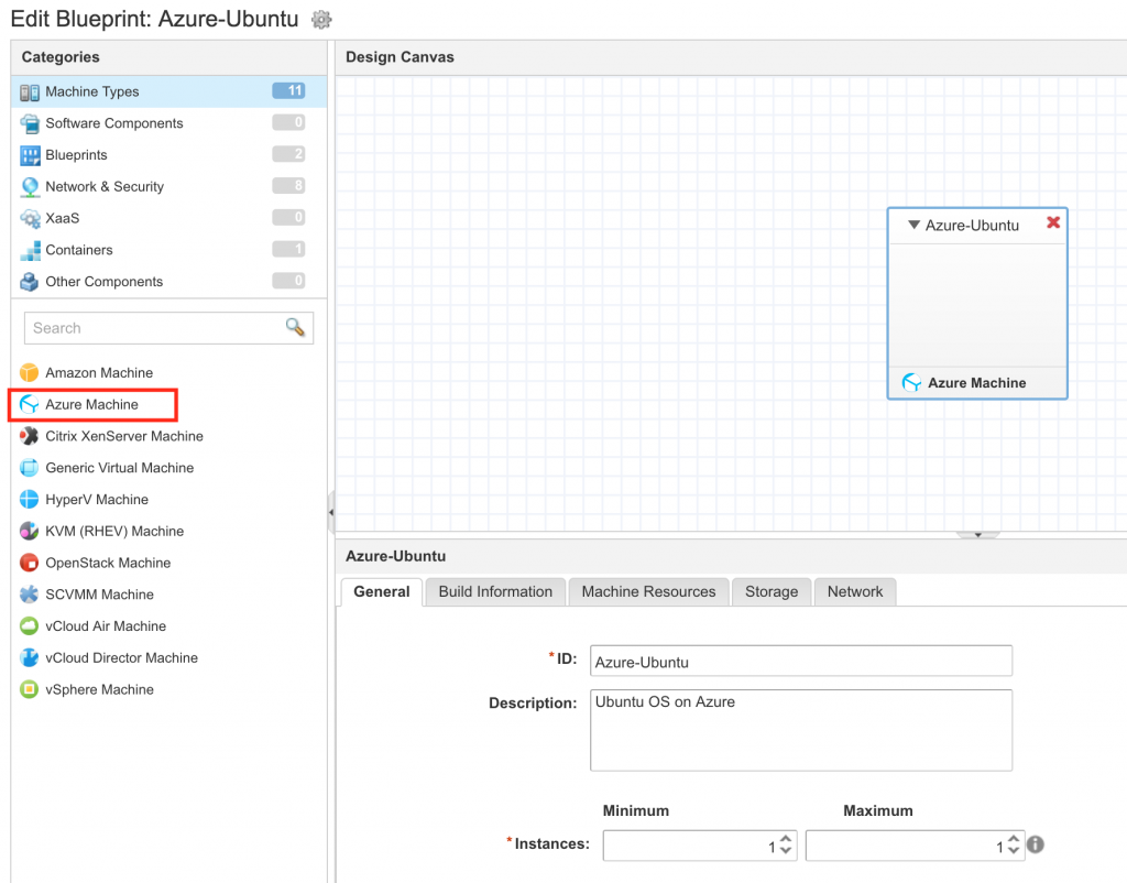 Now that the infrastructure pieces are setup in vRA we can focus on creating our blueprints. Open the design tab and drag in the Azure Machine object. After that the typical ID and description should be added.