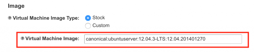 Below this, we’ll have a bit more work to do. We need to specify the image that will used to deploy our server. The “Virtual Machine Image” if set to type “Stock” will be an identifier (called a URN) specified by Microsoft. The format of this image is: