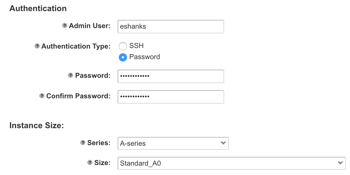 After you’ve entered your URN for the Virtual Machine Image, you’ll need to add some authentication information so that when you deploy your machine, you’ll have a way to login to it. Either SSH or a user/password combination. Lastly, you’ll pick a “Series” and a “Size” which determines how big the new machine will be.