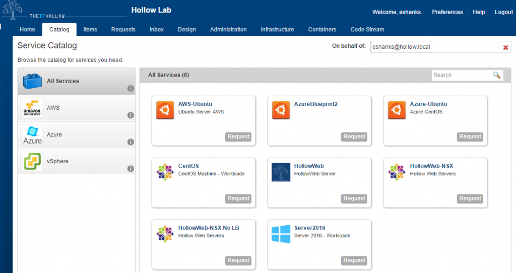 To set the stage, here is my development instance where I have several blueprints at my disposal. Some of them even work! (That was a joke) For this exercise, I want to move the “Server2016” catalog from my development instance to my production instance because I have it working perfectly with my vSphere environment.