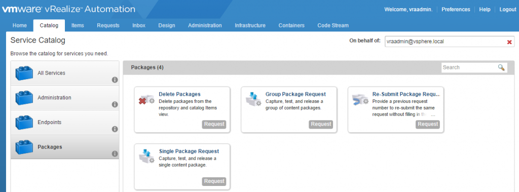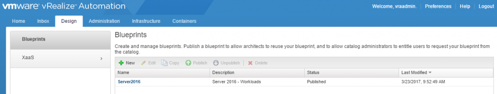 Once the pipeline has executed successfully you can login to your vRA production instance. You’ll see that the Server2016 Blueprint has been moved over and is available as it is here in my production instance.