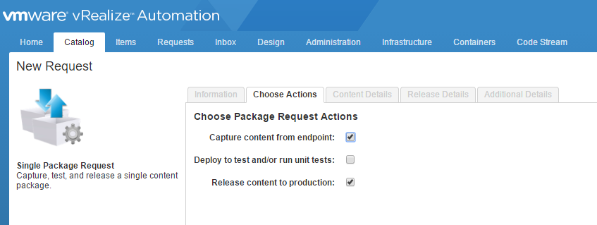 Just like we saw in parts 1 and 2 the first screen that shows up during a request is an information page. Read the information and move on to the next tab. On the “Choose Actions” tab select the “Capture content from endpoint” and “Release content to production” check marks. NOTE: you could also run unit tests as part of this process but you’d also need to specify a test endpoint as well as setting up some unit tests. This functionality isn’t covered in this blog post, instead we’re focused on promoting our code from the development instance to the production instance only. Stay tuned for doing tests on your blueprints as part of this process.