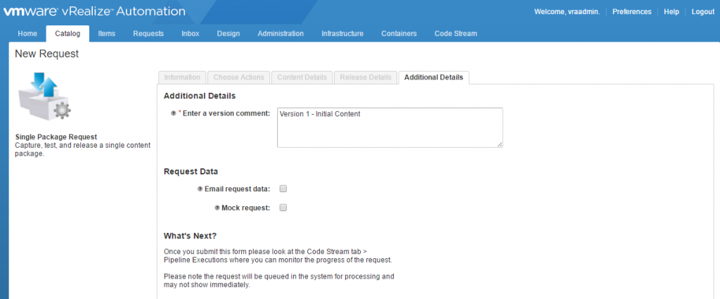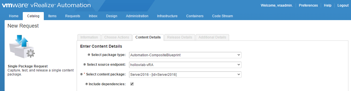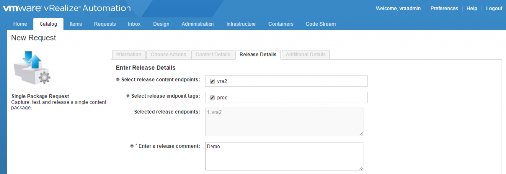 On the “Release Details” tab you’ll need to select the content endpoint where you’ll be deploying the new blueprints. you can also select tags and place a comment on the request.