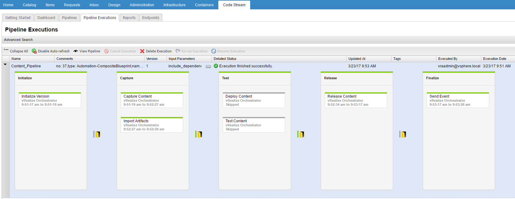 After the request has been made you can move over to the “Code Stream” tab. Under “Pipeline Executions” you’ll be able to monitor the request through each phase. You’ll notice that the pipeline below is successful, but also notice that the “Test” phase was skipped because we didn’t enable that during our request.